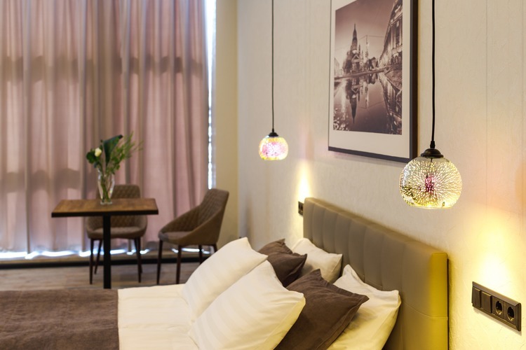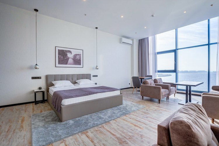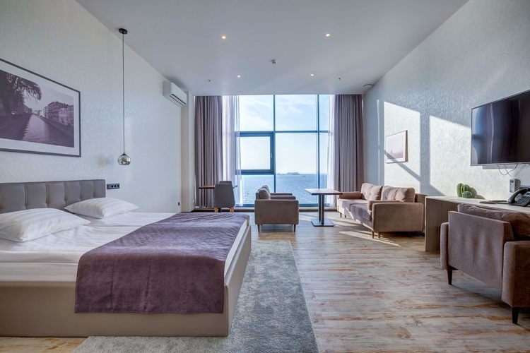 Номер на 5-м этаже с двуспальной кроватью, комфортной гостевой зоной и панорамными окнами из которых открывается завораживающий вид на Финский залив и стадион "Санкт-Петербург Арена". Телефон, телевизор, фен, сейф, холодильник и индивидуальный кондиционер в каждом номере.