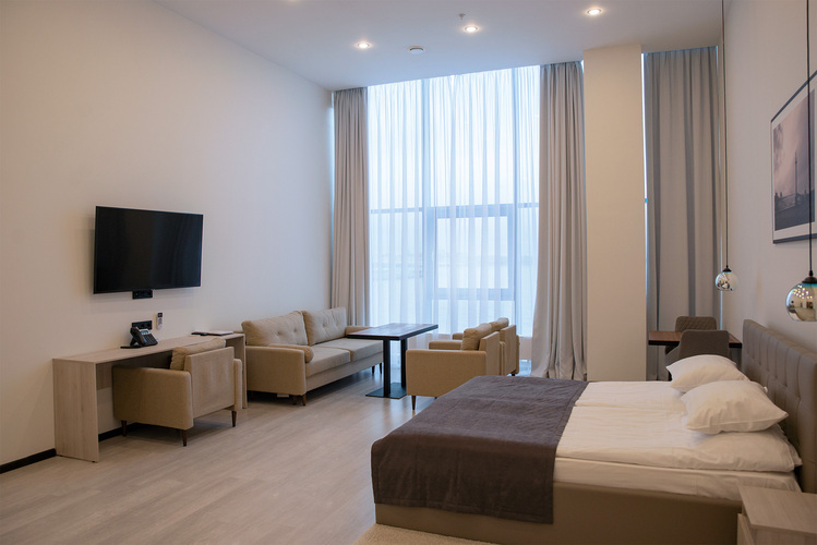 Номер на 3-м этаже с двуспальной кроватью, комфортной гостевой зоной и панорамными окнами из которых открывается завораживающий вид на Финский залив и стадион "Санкт-Петербург Арена". Телефон, телевизор, фен, сейф, холодильник и индивидуальный кондиционер в каждом номере.